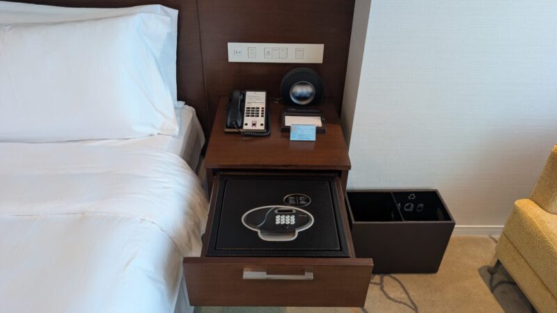 多くのホテルの場合、クローゼット内にセーフティーボックスやパジャマもまとまっているので、ちょっと手間取ります。