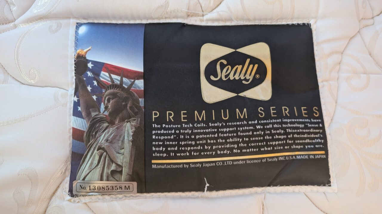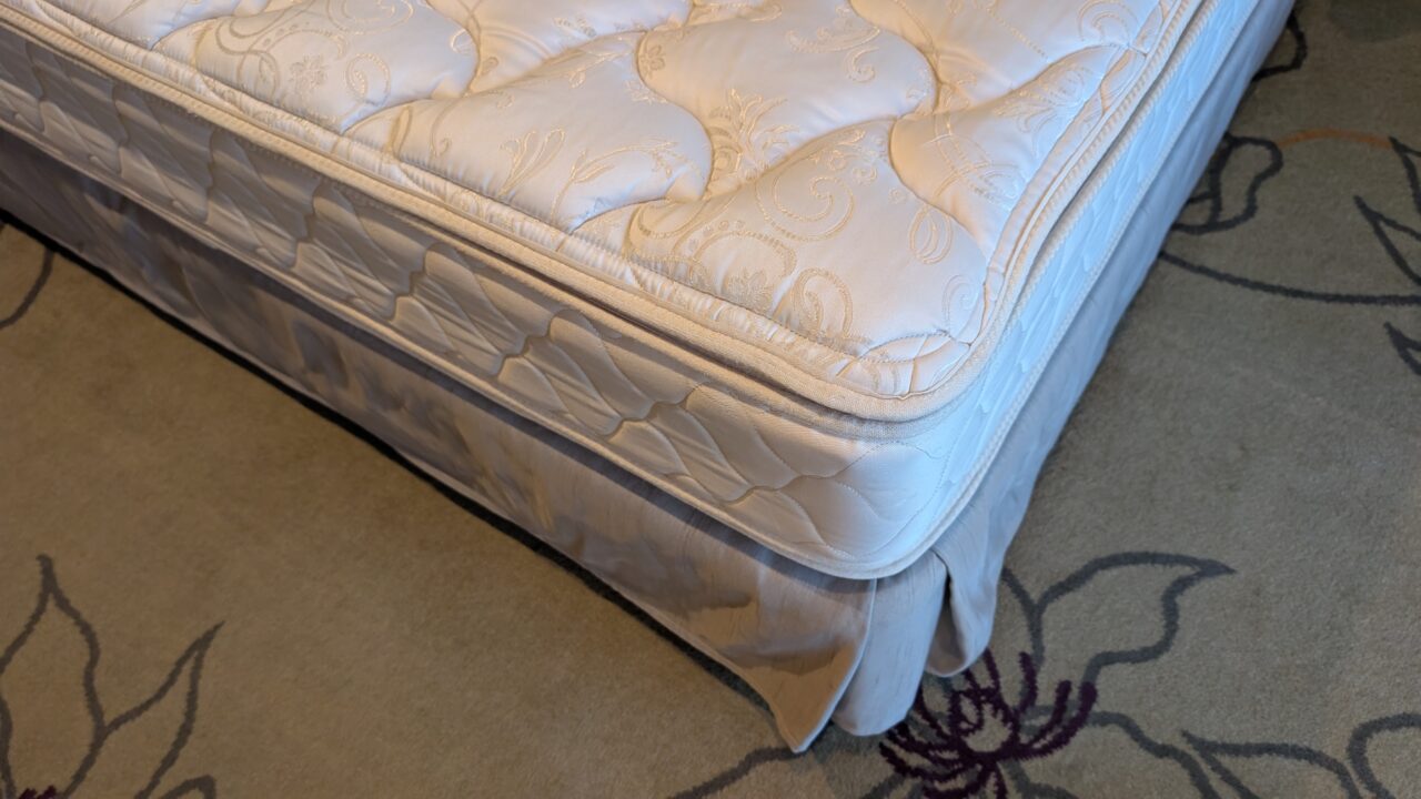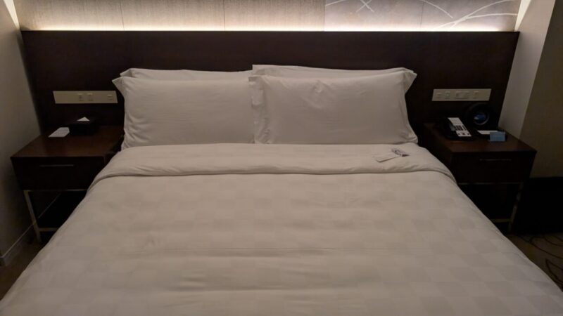 マットレスはSealy(シーリー)。ホテルらしい、少ししっかりめの寝心地。沈みすぎないので、体が安定する感じがあります。柔らかすぎるベッドが苦手な人にはちょうどいいかもしれません。