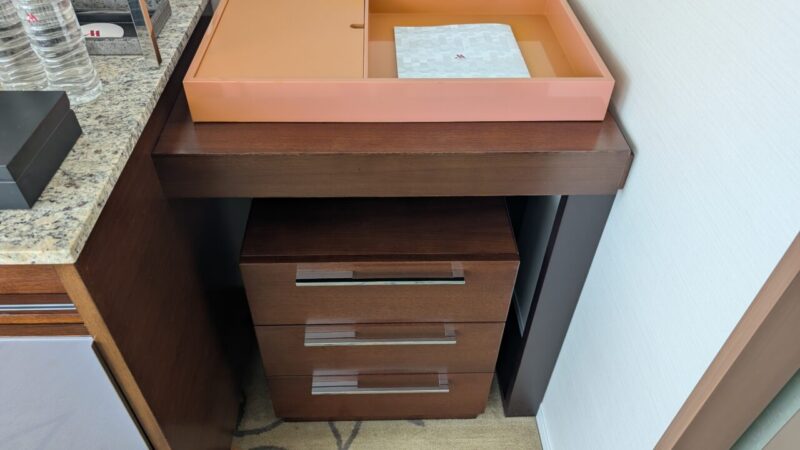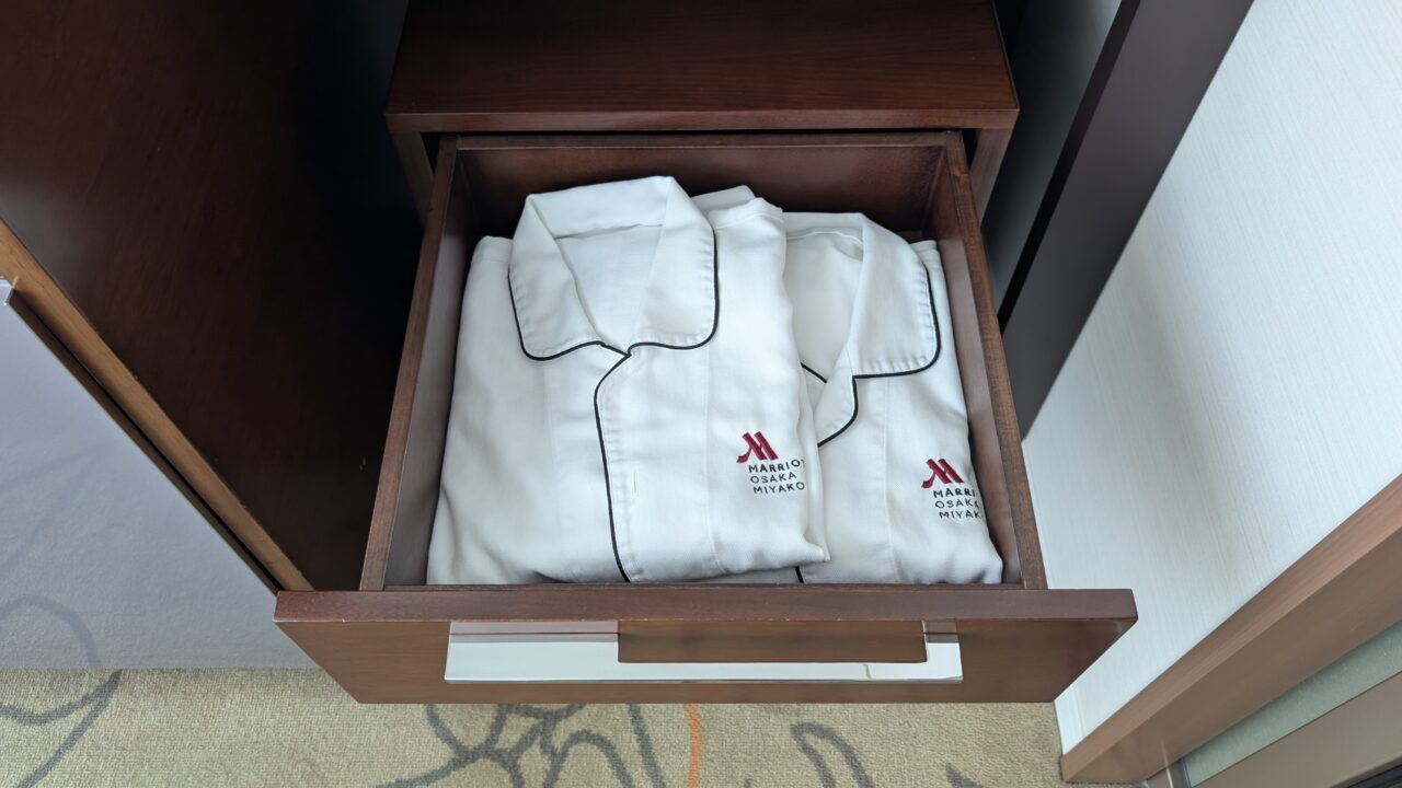 パジャマはミニバー横の棚にありました。引き出しを開けると、きれいに畳まれて入っています。