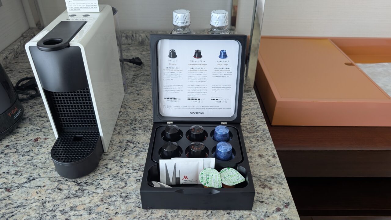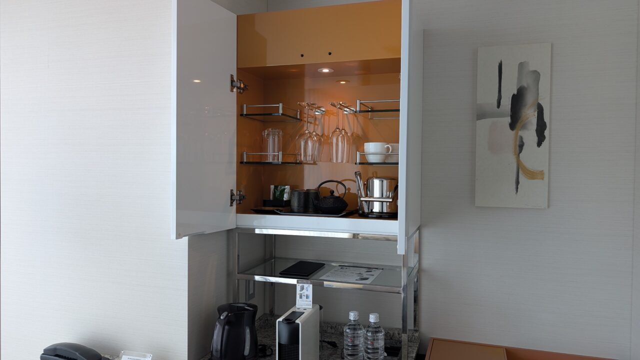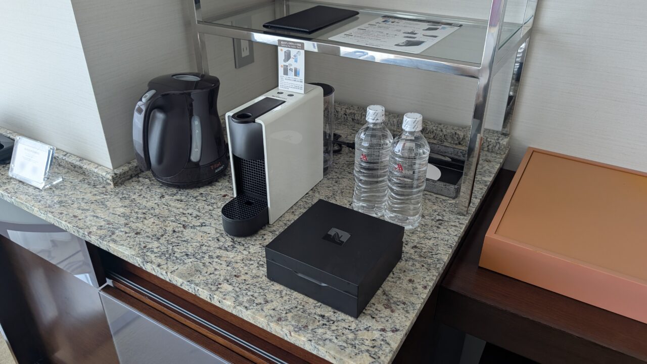 ミニバーカウンターもきれいにまとまってます。これだけスペースがあるとお湯ポットやネスプレッソも使いやすい。