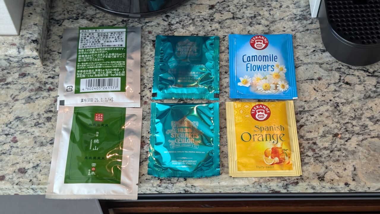 ティーパックの種類は、カモミール、オレンジ、セイロン、煎茶もあります。