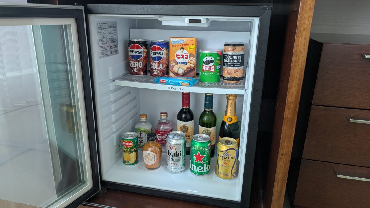 ミニ冷蔵庫は、中はしっかり詰まってます。お酒もソフトドリンクも一通り。使うかどうかは別として、「ここで完結できる」状態があると安心感が違います。