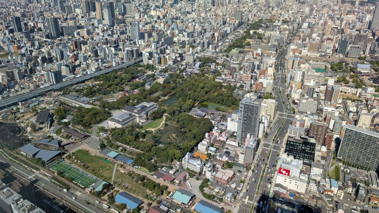 視線を落とすと、天王寺公園や動物園、てんしばが見えます。地上の動きはあるのに、ここからだとほとんど音が届かない。静かに見える。この距離感、高層階ならでは。