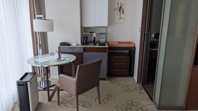 テーブルまわりを見ると、必要なものがきれいにまとまっています。ミニバーやコーヒーも一通り揃っていますが、雑多な感じがない。使いやすい位置にまとまっています。
