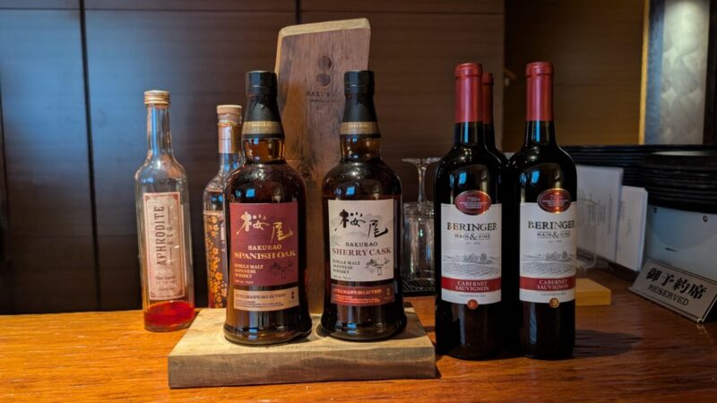 出入口付近に、木目で統一されたミニバーが設置されています。外観は非常にシンプルで、空間全体のトーンを崩さないデザインです。