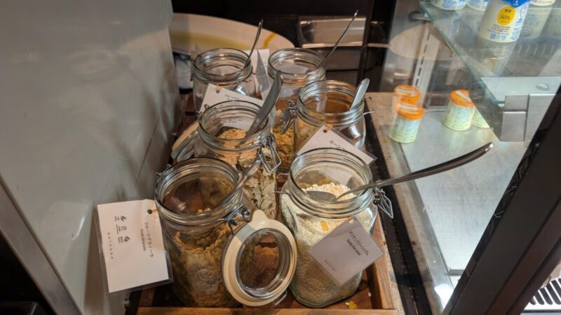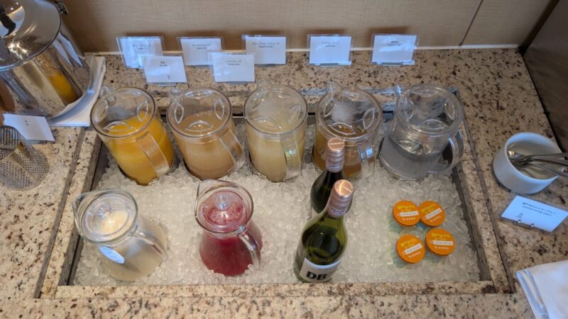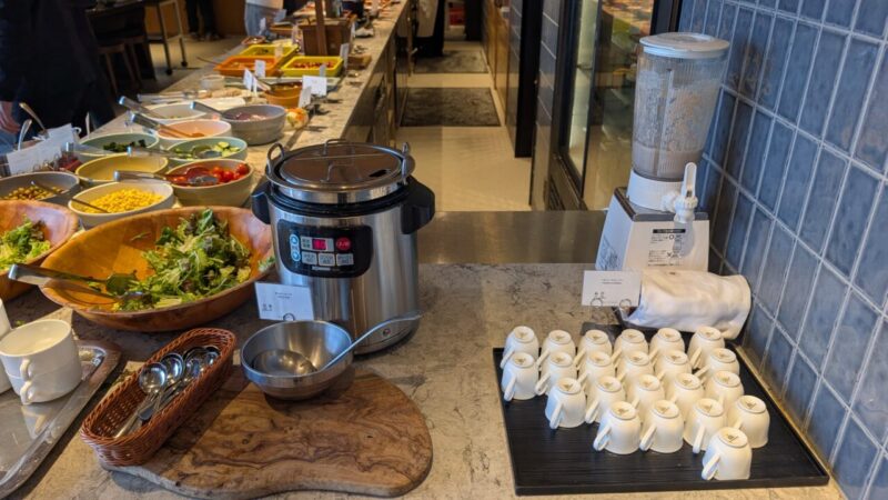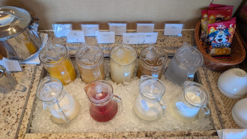 ブッフェカウンター周辺には、コーヒーマシンやジュース類、青汁などがまとまっていて、一通りのドリンクはここで完結します。
