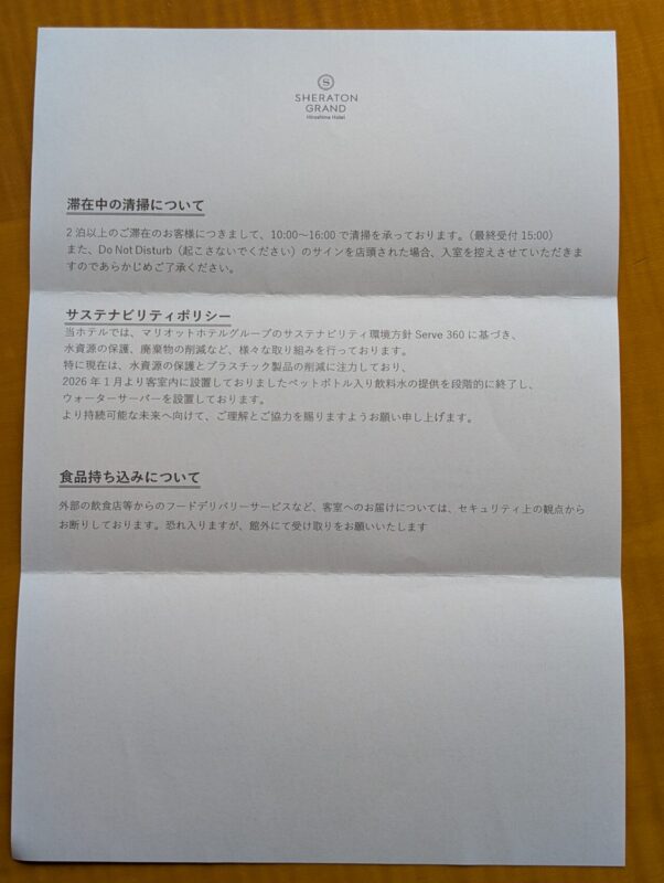 裏には清掃時間やサステナビリティ、持ち込みルールなどが記載されています。滞在中の前提条件が明確に示されています。こうした整備が、滞在全体の快適さを支えています。