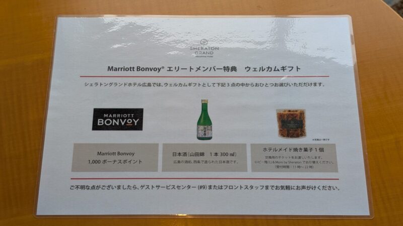 シェラトングランドホテル広島のエリートメンバー向けのウェルカムギフトは、ポイント・日本酒・焼き菓子の3つから選択。今回は1,000ポイントを選びました。