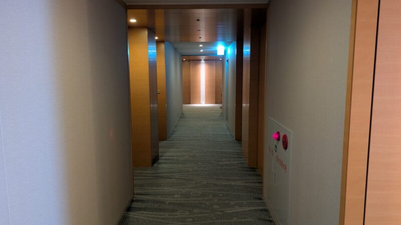 客室フロアの廊下は、照明がやや落とされていて落ち着いた雰囲気。足音も響きにくく、プライベート感があります。