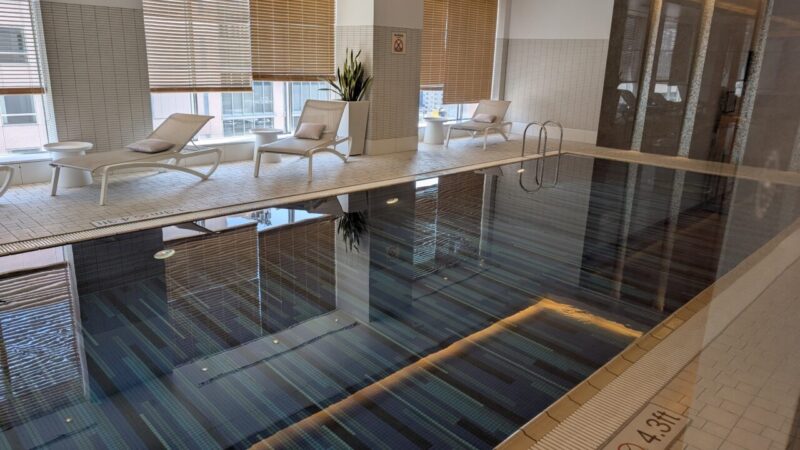 プールサイドにはリクライニングチェアが並び、大きな窓から自然光が入ることで、閉塞感はほとんどありません。都市型ホテルでありながら、空間に“余白”があります。