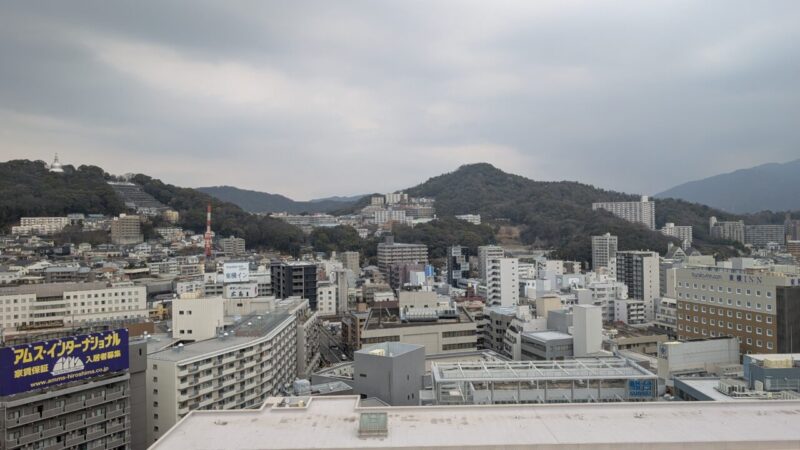 北側には街並みと山の稜線が広がり、丘の上には平和塔が見えます。都市と自然が同時に視界に入るバランスです。