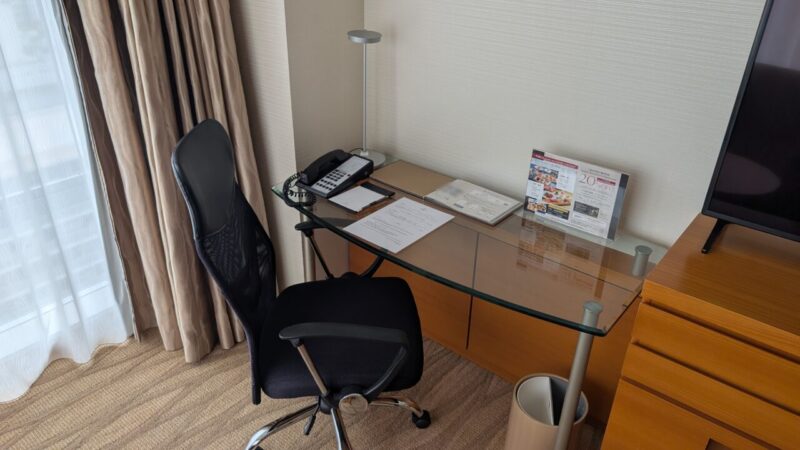 ガラス天板のデスクにオフィスチェア、実用性の高いワークスペースです。PC作業や軽い仕事であれば十分に対応できる環境。