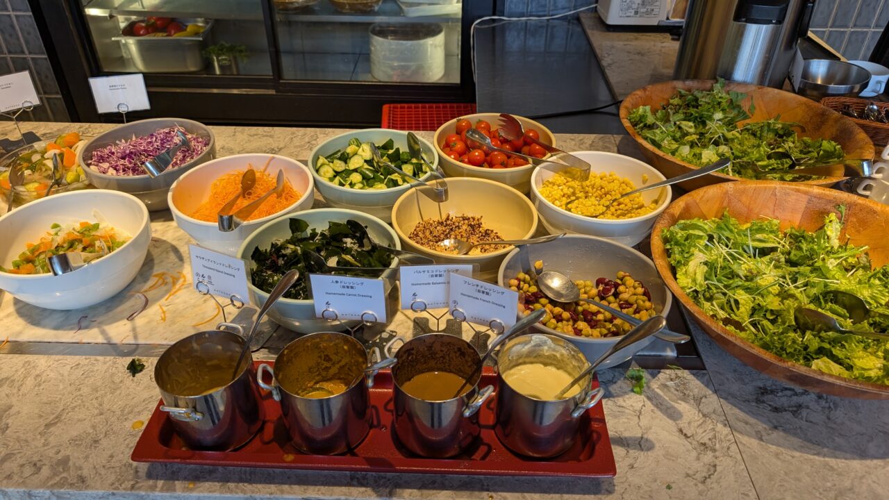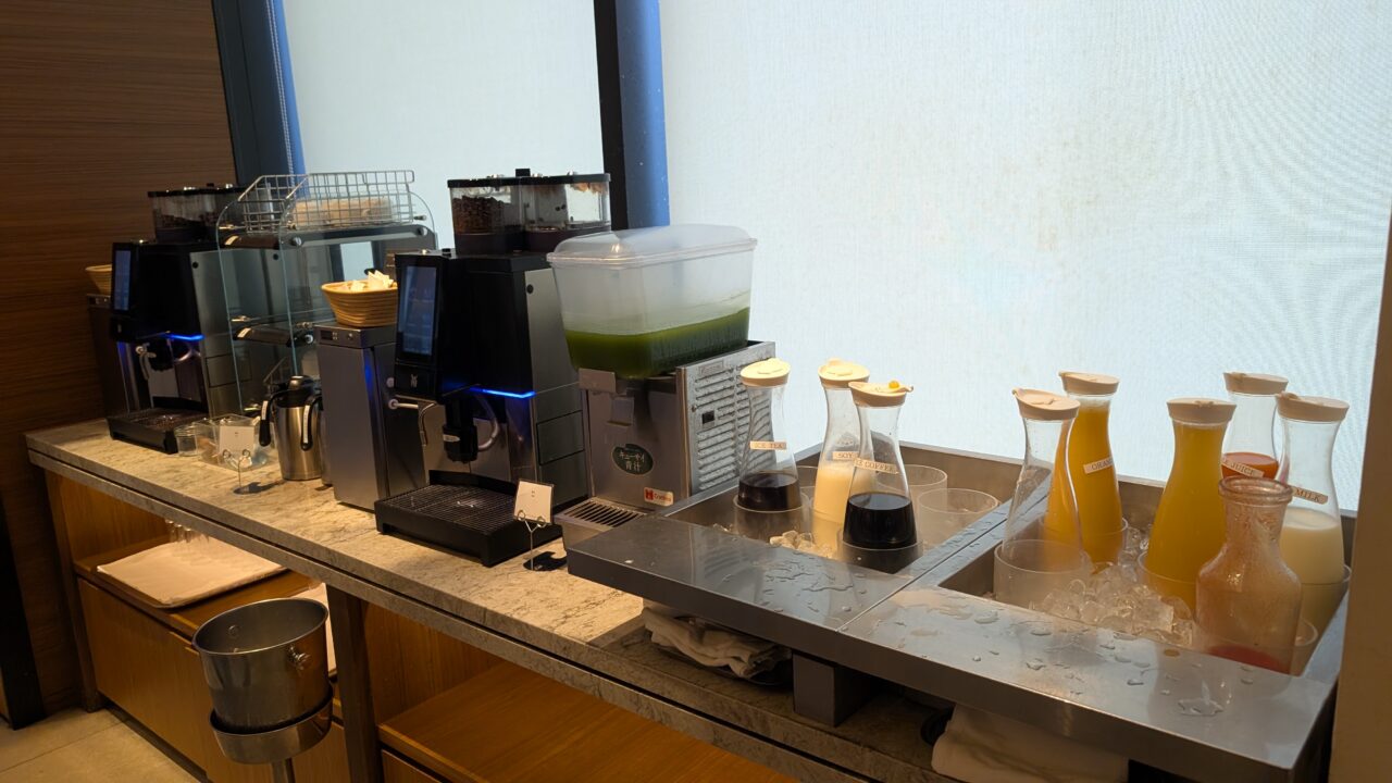 ブッフェカウンター周辺には、コーヒーマシンやジュース類、青汁などがまとまっていて、一通りのドリンクはここで完結します。