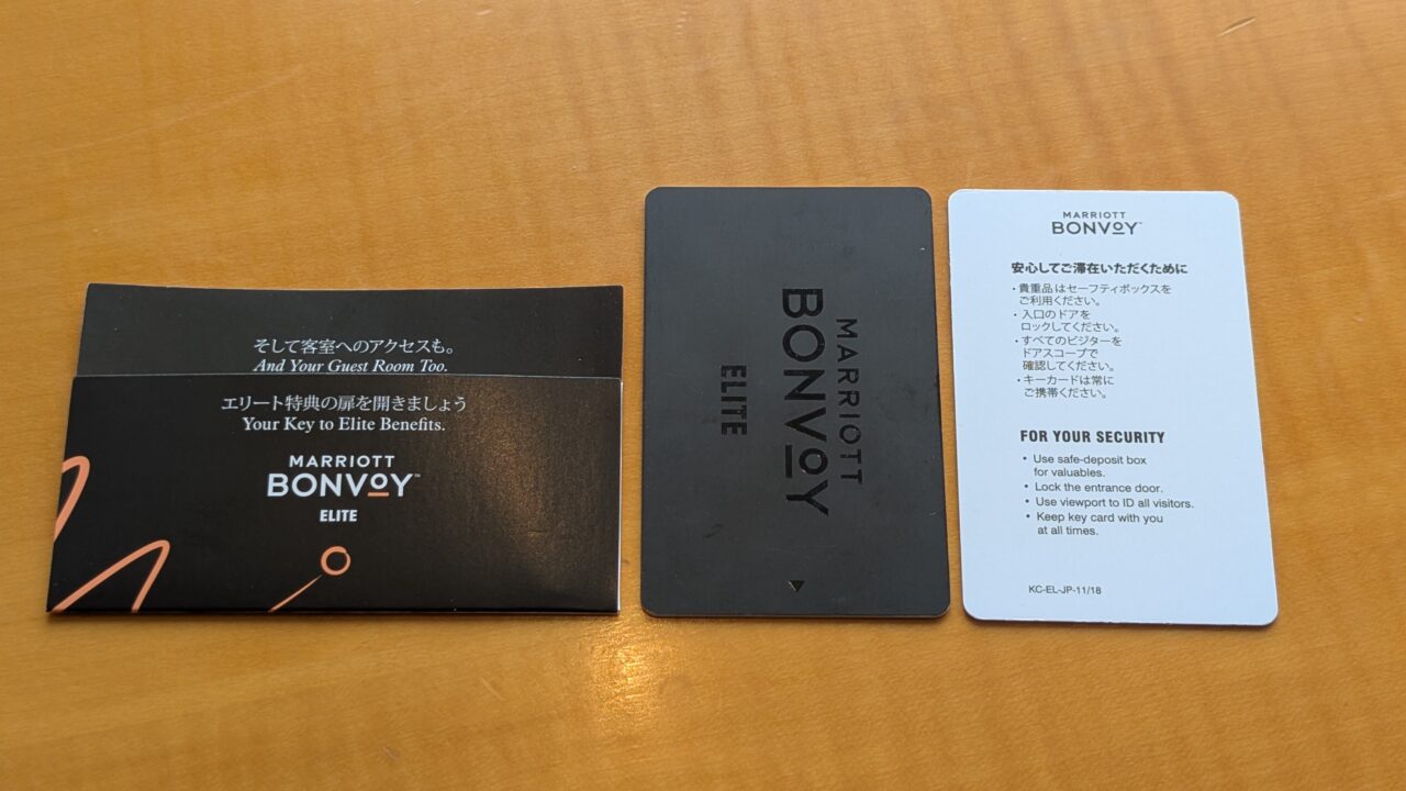 チェックインが完了し、ルームキーを受け取ります。マリオットボンヴォイのエリート用ケース。