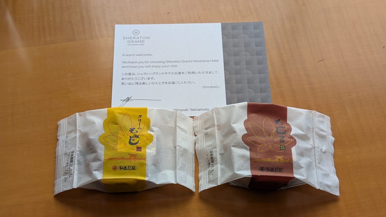 ウェルカムギフトは、やまだ屋のもみじ饅頭、広島らしいシンプルなおもてなしです。