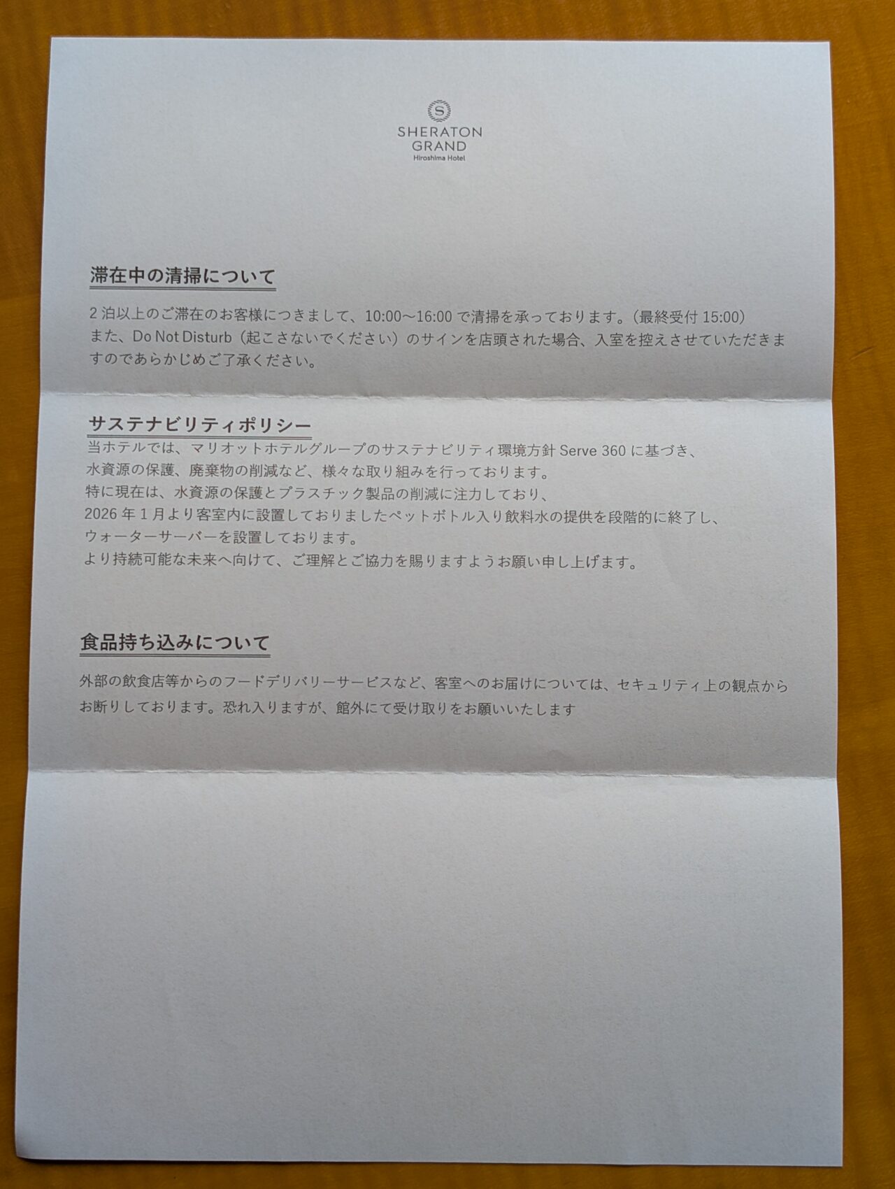 裏には清掃時間やサステナビリティ、持ち込みルールなどが記載されています。滞在中の前提条件が明確に示されています。こうした整備が、滞在全体の快適さを支えています。