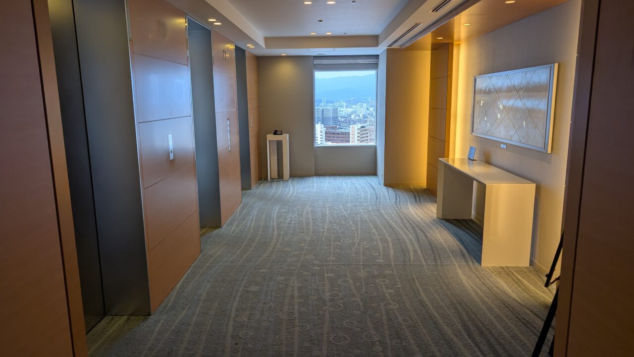 客室フロアの廊下は、照明がやや落とされていて落ち着いた雰囲気。足音も響きにくく、プライベート感があります。