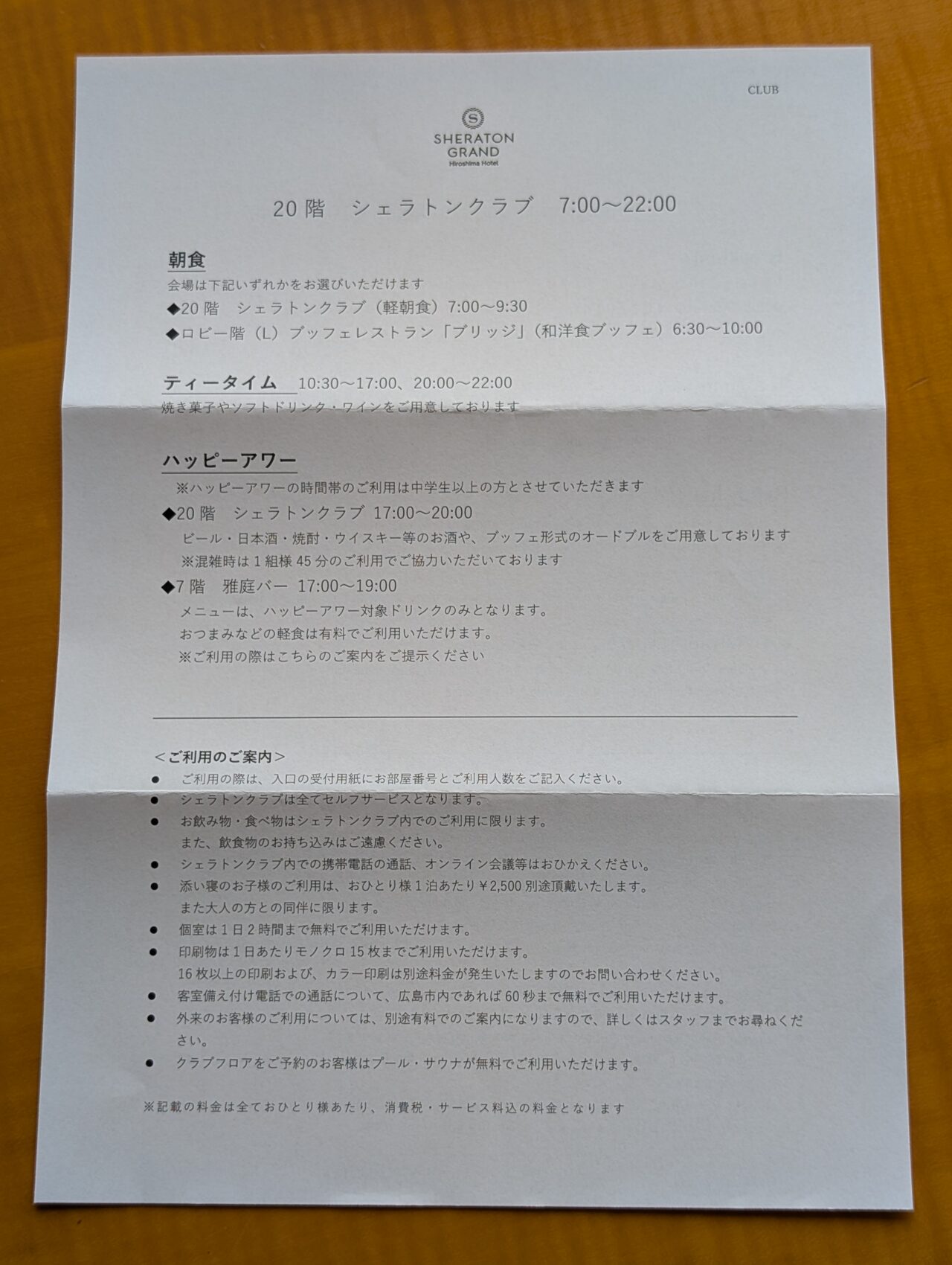 館内のレストランやスパ、営業時間などがまとめられた案内です。必要な情報がシンプルに整理されています。朝食の混雑時間帯まで明記されているのは実用的です。滞在中の判断を減らしてくれる設計です。