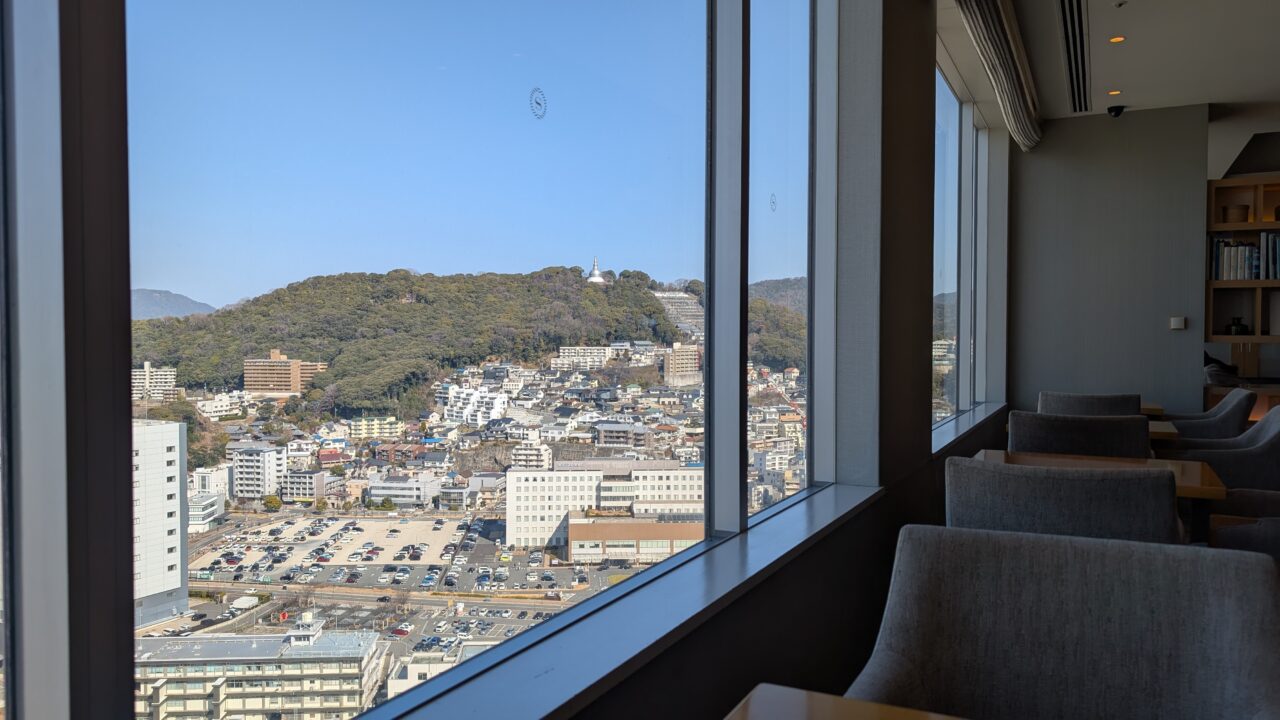 北側には街並みと山の稜線が広がり、丘の上には平和塔が見えます。都市と自然が同時に視界に入るバランスです。