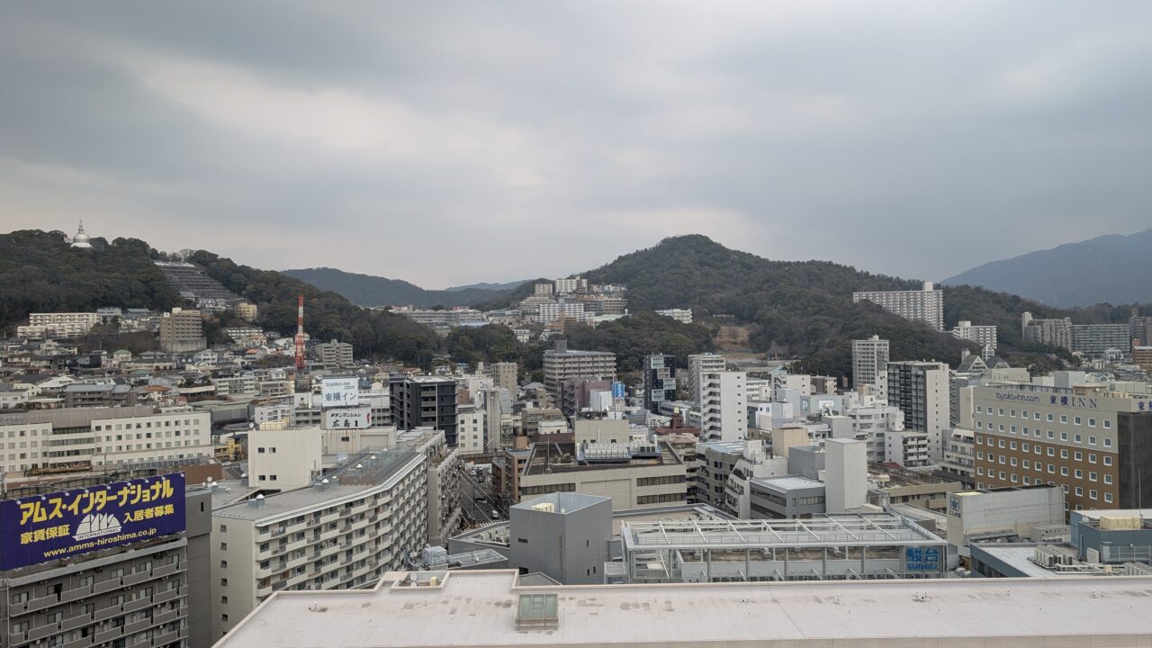 西側は広島駅。線路や大きな道路が見え、都市の動きが感じられる景色です。